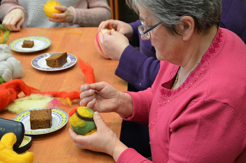 Filcowanie, czyli spilśnianie uchodzi za najstarszą metodę wytwarzania materiału. Praca z wełną owczą stwarza wiele możliwości twórczego rozwoju. Korzystając z techniki filcowania na sucho można wyczarować przestrzenne, kolorowe formy. W trakcie zajęć panie poznały technikę filcowania na sucho, samodzielnie ozdabiały wielkanocną pisankę za pomocą wełny owczej oraz dowiedziały się, jakie materiały i narzędzia można wykorzystać przy filcowaniu na sucho.