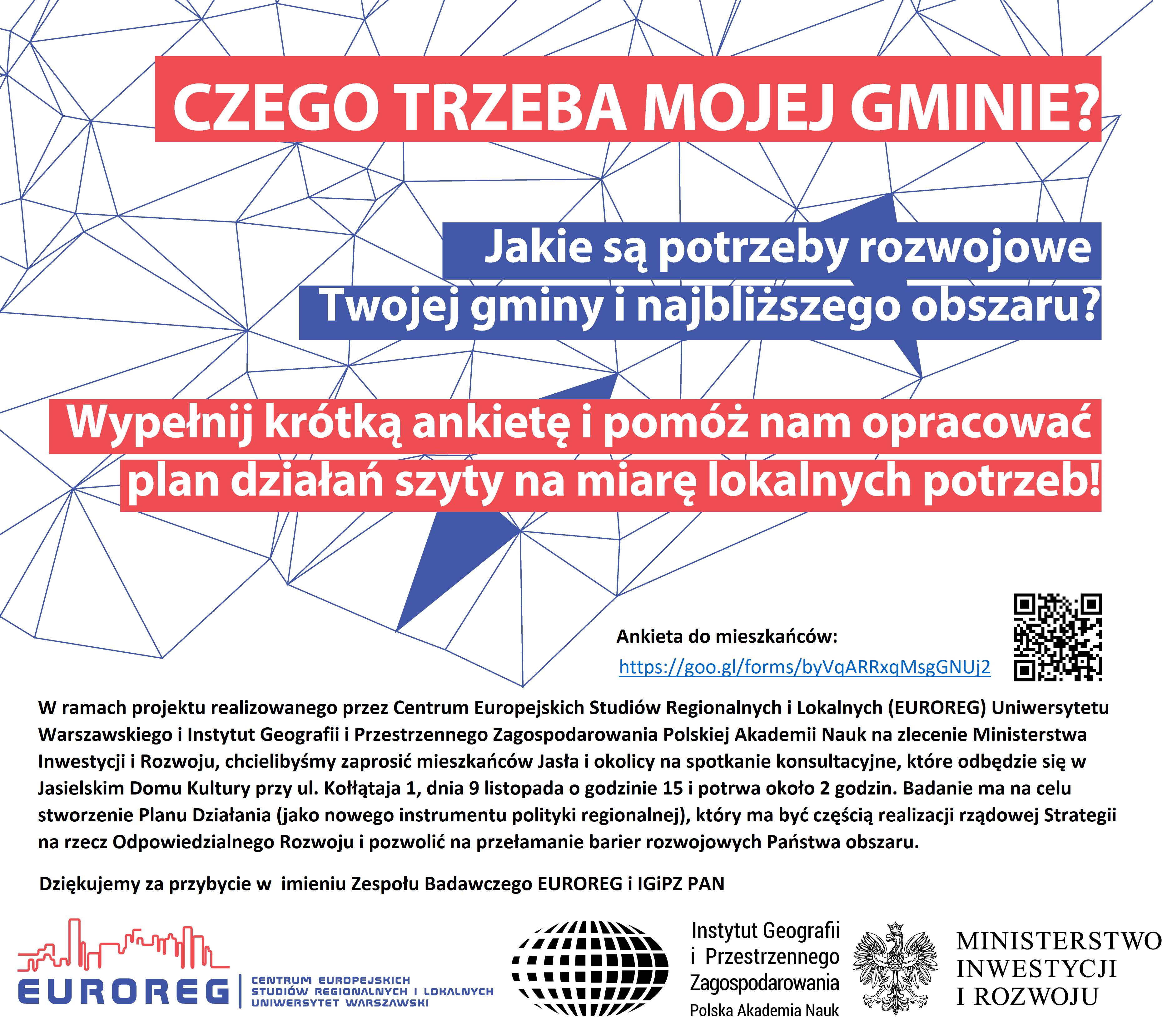 Zespół Badawczy EUROREG i IGiPZ PAN serdecznie zaprasza wszystkich mieszkańców i przedsiębiorców do wypełnienia ankiety, która ma pomóc w stworzeniu Planu Działania (jako nowego instrumentu polityki regionalnej), który ma być częścią realizacji rządowej Strategii na rzecz Odpowiedzialnego Rozwoju i pozwolić na przełamanie barier rozwojowych.