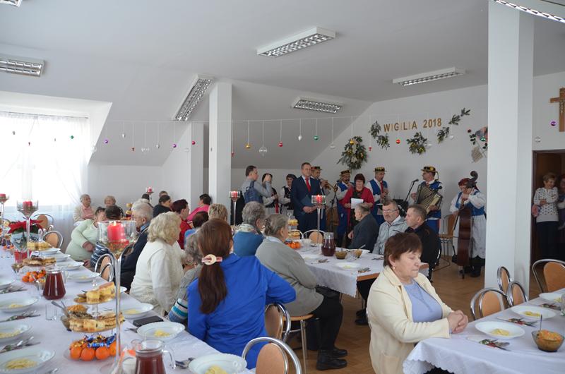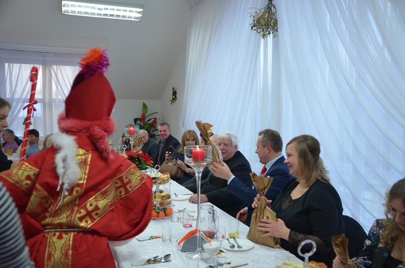 Spotkanie rozpoczęła Przewodnicząca Koła Gospodyń uroczystym powitaniem zaproszonych gości. W świąteczny klimat zebranych wprowadziły życzenia złożone przez Wójta oraz księdza Dziekana. Po poświęceniu opłatków i tradycyjnym przełamaniu się nimi, uczestnicy spotkania zostali zaproszeni do świątecznego obiadu, który składał się z tradycyjnych potraw wigilijnych.