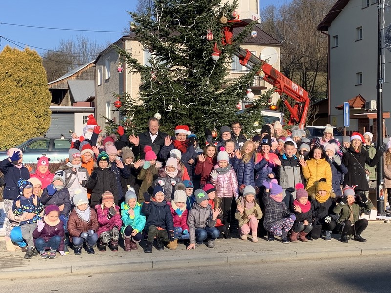 Na jodłowskim rynku stanęła duża, żywa choinka. 6 grudnia 2019r. dzieci wieszały na niej przygotowane przez siebie ozdoby.
