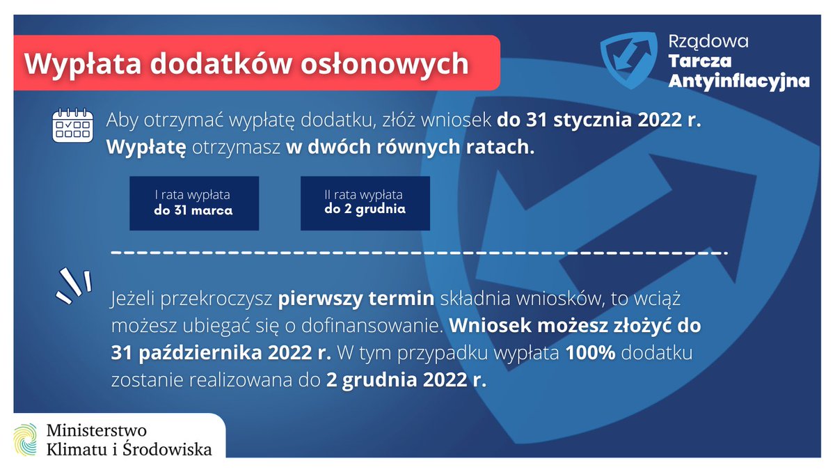 W przypadku wniosków o dodatek osłonowy złożonych do 31 stycznia 2022r. wypłata zostanie realizowana w 2022 r. w 2 równych ratach, tj. do 31 marca i do 2 grudnia. Osoby, które nie złożą wniosku do końca stycznia, nadal będą mogły to zrobić, jednak nie później niż do 31 października 2022 r. W tym przypadku wypłata 100% dodatku zostanie zrealizowana do 2 grudnia 2022 r.