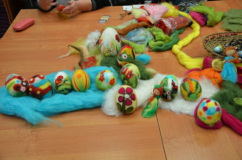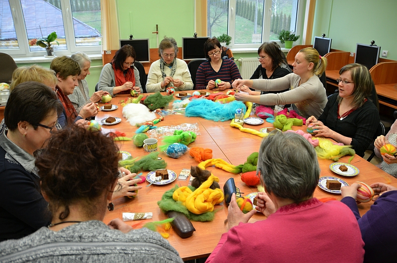 Filcowanie, czyli spilśnianie uchodzi za najstarszą metodę wytwarzania materiału. Praca z wełną owczą stwarza wiele możliwości twórczego rozwoju. Korzystając z techniki filcowania na sucho można wyczarować przestrzenne, kolorowe formy. W trakcie zajęć panie poznały technikę filcowania na sucho, samodzielnie ozdabiały wielkanocną pisankę za pomocą wełny owczej oraz dowiedziały się, jakie materiały i narzędzia można wykorzystać przy filcowaniu na sucho.