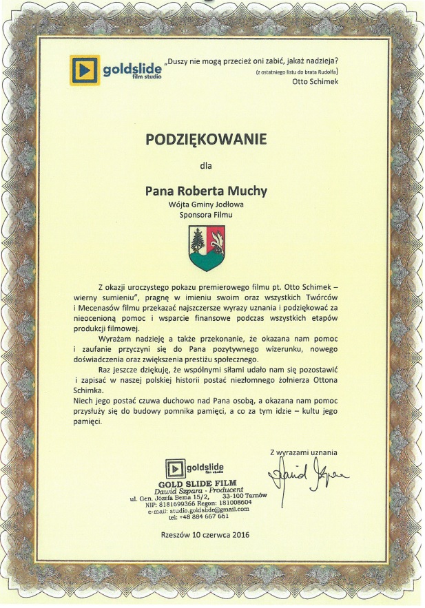 W premierze filmu udział wziął ks.dr Julian kapłon, ks. dr Zenon Tomasiak – kustosz Sanktuarium Dzieciątka Jezus w Jodłowej, jak również Wójt Gminy Jodłowa Robert Mucha , jako jeden ze sponsorów filmu „Otto Schimek.Wierny sumieniu”. Po premierze filmu wszystkie osoby, które przyczyniły się do jego powstania otrzymały z rąk reżysera Pana Dawida Szpary serdeczne podziękowania.