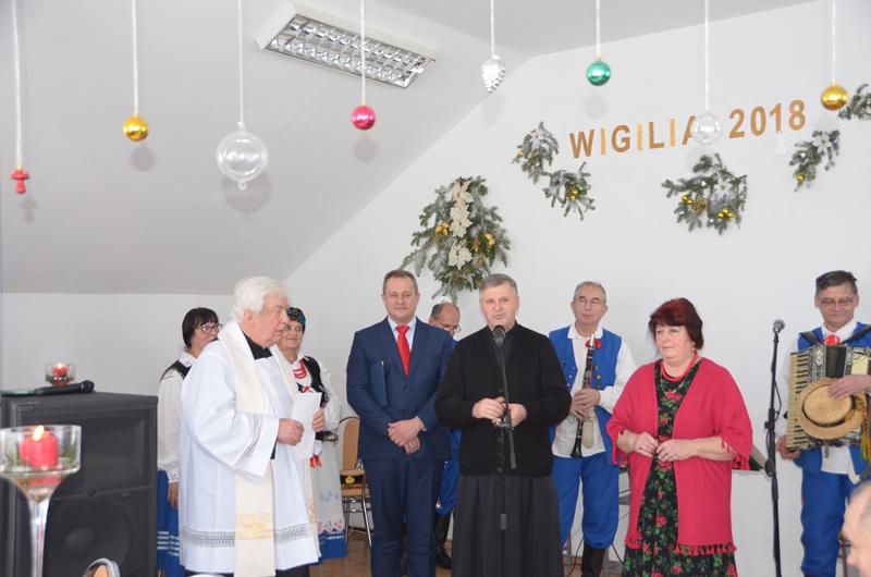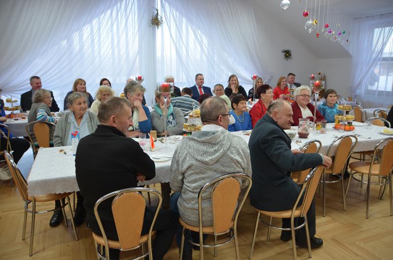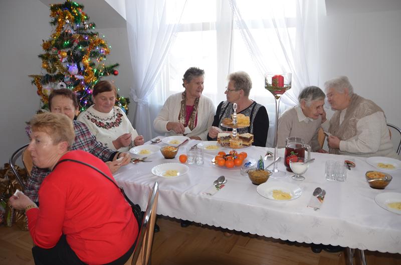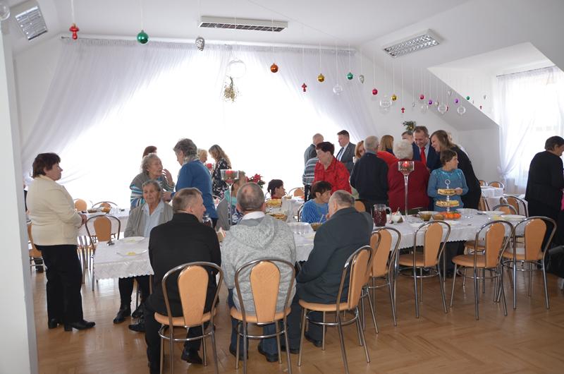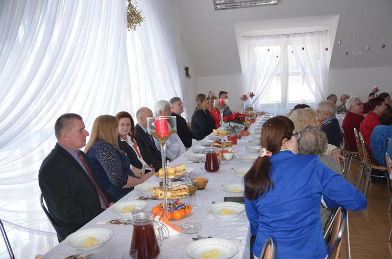 Spotkanie rozpoczęła Przewodnicząca Koła Gospodyń uroczystym powitaniem zaproszonych gości. W świąteczny klimat zebranych wprowadziły życzenia złożone przez Wójta oraz księdza Dziekana. Po poświęceniu opłatków i tradycyjnym przełamaniu się nimi, uczestnicy spotkania zostali zaproszeni do świątecznego obiadu, który składał się z tradycyjnych potraw wigilijnych.