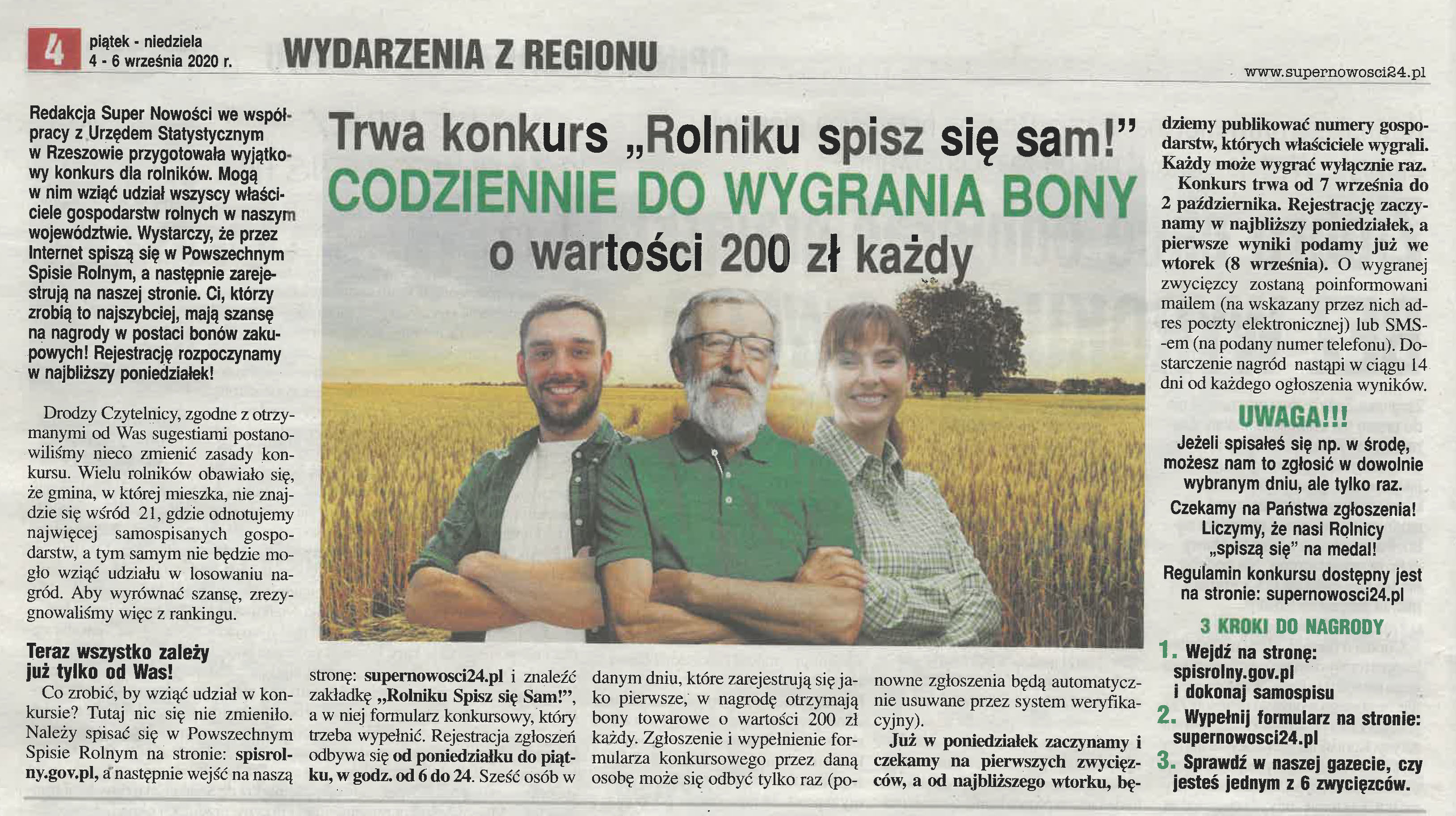 7 września br. w gazecie codziennej Super Nowości rusza konkurs „Rolniku spisz się sam” związany z Powszechnym Spisem Rolnym 2020.