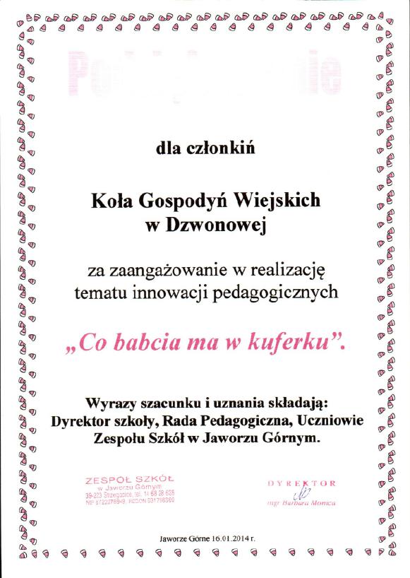W dniu 18 stycznia przedstawicielki Koła Gospodyń Wiejskich w Dzwonowej zostały zaproszone przez dyrekcję Zespołu Szkół w Jaworzu Górnym do udziału w projekcie "Co babcia ma w kuferku".