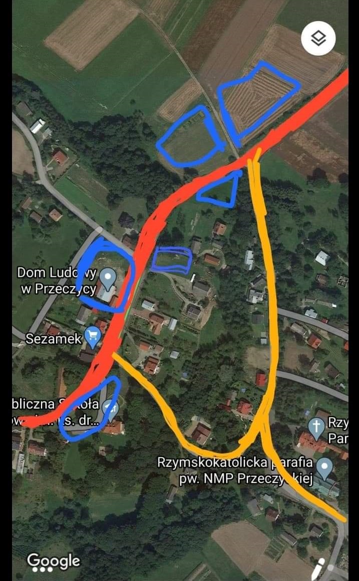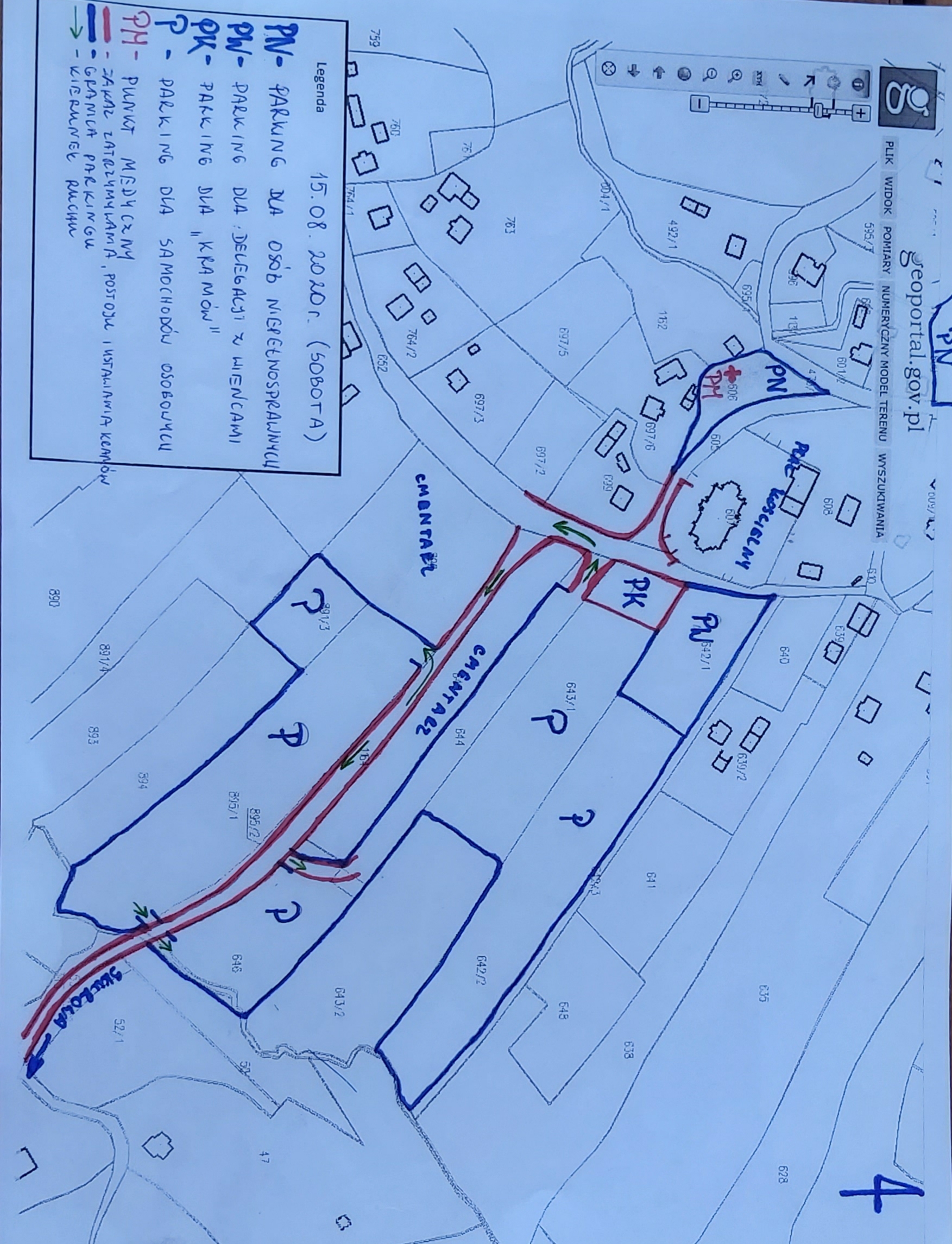 Kolorem pomarańczowym droga, która będzie wykorzystana do dojazdu osób posiadających legitymację inwalidzką, wieńce, oprawa liturgiczna. Kolor niebieski to przewidziane miejsca parkingowe przy Domu Ludowym, Szkole Podstawowej, na dostępnionych działkach prywatnych.